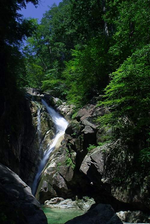 駐車場から登山道に入り最初にある滝で、 正確には登山道から分岐して見る事ができます。 天候は快晴、突き抜けるような青空の中、花崗岩の谷間を鋭く流れ落ちていました。 滝名の通り、やや渦を巻くように流れ落ちていて迫力のある滝です。