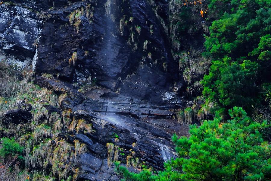 直下は吊り橋で対岸に渡り、遊歩道利用で辿り着けますが、落石に十分注意する必要があります。